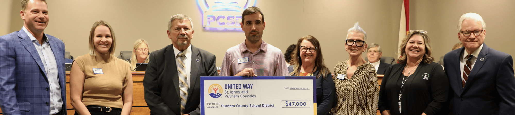 PALATKA, FL – At the October 21st Putnam County School District Board meeting, United Way of St. Johns and Putnam Counties, President and CEO Carl Cricco, presented a check for $47,000 to support literacy initiatives throughout Putnam County.